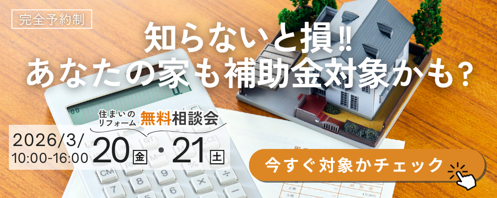 熊谷市|リフォームをご検討中の方へ熊谷市でリフォームをご検討中の方から、このようなご相談をよくいただきます。 リフォームって何から始めればいいの?費用はどのくらいかかるの?今すぐやるべき?まだ先でも大丈夫?業者に相談すると営業されそうで不安 リフォームは決して安い買い物ではありません。そのため「失敗したくない」「まずは情報を知りたい」という方も多いのではないでしょうか。 特に築20年以上の住宅では、設備の交換時期や今後のメンテナンスについて悩まれる方が増えています。そこでホームウェル熊谷では、「住まいのリフォーム無料相談会」を開催いたします! 現在のお住まいの状況やご希望をお聞きしながら、今リフォームが必要な場所まだ使える設備リフォーム費用の目安今後の住まいのメンテナンスなどを、分かりやすくご説明いたします。 「まずは話だけ聞いてみたい」という方も、お気軽にご参加ください。 相談できるリフォーム内容相談会では、住まいに関する様々なリフォームについてご相談いただけます。 キッチンリフォームお風呂リフォームトイレリフォーム洗面リフォーム内装リフォーム窓・玄関リフォーム断熱リフォーム外壁・塗装など外装リフォーム補助金を使ったリフォーム 「どこから直すべきか分からない」という方も、住まいの状況を整理しながらご説明いたします。 こんな方におすすめ!✔ 初めてリフォームを検討中✔ 築20年以上の家に住んでいる✔ 水回りの交換時期が気になっている✔ 全部直すべきか、一部だけで良いのか知りたい✔ リフォーム費用の目安を知りたい✔ まずは相談から始めたい 「まだなにも具体的に決まっていない」「とりあえず話を聞いてみたい」そんな段階の方でも、安心してご参加いただけます。 完全予約制・個別対応で安心無料相談会は 完全予約制・個別対応 で行っています。 待ち時間なし他の方を気にせず相談できる図面や写真を見ながら具体的に話せる 無理な営業等はありません。「工事を決める前の情報収集の場」 として、お気軽にご利用ください。 開催日時2026年3月27日(金)、3月28日(土)10:00~16:00 ※ご予約の締め切りは 2026年3月21日(土)まで となります。 開催場所(お選びいただけます)ホームウェル熊谷(事務所) ・埼玉県熊谷市大原2-8-14 LIXIL 熊谷ショールーム ・埼玉県熊谷市肥塚4-115 落ち着いてじっくり相談したい方も、実際の商品を見ながら話したい方も、ご希望に合わせて会場をお選びいただけます。 ※熊谷市・深谷市・行田市・鴻巣市など、近隣エリアからも多くの方にご相談いただいています。 無料相談会|予約方法ご予約は、お電話またはWEBフォームから受け付けております。 お電話:050-7586-2716WEB予約:下記お問い合わせフォームより ご予約の際に、「リフォーム無料相談会に参加したい」 とお伝えください。 事前予約がおすすめ!うれしい特典付き事前予約で、うれしい特典をご用意しています!お電話またはWEB予約の際に、「リフォーム無料相談会に参加したい」とお伝えいただいた方には、以下の特典をご用意しています♪ 【ご予約特典】 ご予約いただいた方には、ささやかなプレゼントをご用意しています。 【お見積り特典】 ご予約のうえ、お見積りをご依頼いただいた方には、500円分のクオカードをプレゼント! ※ご相談のみのご参加も可能です。※ご予約枠には限りがありますので、お早めのご予約がおすすめです。 ご相談の際にあるとスムーズなもの(なくてもOK)本格的にお話を進めたい方や、ある程度内容が決まっている方は、以下をお持ちいただくとスムーズです。 お住まいの図面気になる箇所の写真検討中の商品資料など もちろん、手ぶらでもご参加いただけます! よくある質問Q. 相談したら必ず工事しなければいけませんか?→ いいえ、そのようなことはありません。相談のみの参加の方も多くいらっしゃいます。 Q. 全部を直さないといけませんか?→ いいえ。今の状態を確認し、必要な部分だけを整理してご提案いたします。無理に工事をおすすめすることはありません。 まだ何も決めていません→ 問題ありません。内容を整理する場としてご利用ください。 Q. 費用はかかりますか?→ 相談・見積り・現地確認すべて無料です。 まずは「相談」からはじめてみませんか?初めてのリフォームは、「何から始めればいいのか分からない」という方がほとんどです。 まずは今のお住まいの状態を整理し、必要なリフォームや今後のメンテナンスについて確認してみませんか? 住まいの悩みや疑問を解決する場として、ぜひ無料相談会をご利用ください。 ご相談・お見積り・現地調査はすべて無料です。熊谷市周辺でリフォームをご検討中の方は、ぜひお気軽に「LIXILリフォームショップ ホームウェル熊谷」までご相談ください。