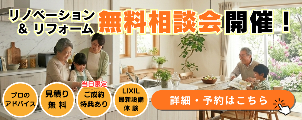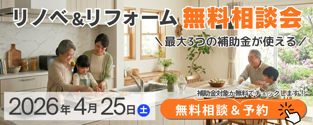 【熊谷市】補助金対象か無料でチェック! リノベーション&リフォーム 無料相談会を開催 今なら、国・埼玉県・熊谷市 3つの補助金を併用して、お得にリフォームができるチャンスです! ただし、補助金は予算に達し次第終了となる場合があります。後から「使えたのに…」と後悔しないためにも、一度チェックしておくのがおすすめです。 ■ イベント概要日程:2026年4月25日(土)時間:10:00~16:00会場:LIXIL熊谷ショールーム参加費:無料(予約優先) ご予約は、お電話(0120-598-235)または下記WEBフォームから受け付けております。 ■ 使える補助金とは?国(最大100万円)埼玉県(国の1/2以内)熊谷市(最大10万円) 3つのリフォーム補助金が併用可能! 内容によっては、知らずにリフォームすると損してしまう可能性もあります。 イベントでは、補助金対象になるか無料でチェック できます。まずは対象になるかどうかだけでも、お気軽にご相談ください。 > 国の補助金についてはコチラ:> 埼玉県の補助金についてはコチラ:> 熊谷市の補助金についてはコチラ: ※補助金は予算がなくなり次第終了となります。 ■ 相談できるリフォーム住まいに関する幅広いご相談が可能です。 中古住宅リノベ&リフォーム二世帯住宅リフォーム間取り変更リフォーム断熱リフォームキッチンリフォームお風呂リフォームトイレリフォーム洗面リフォーム内装リフォーム窓・玄関リフォーム外壁・塗装など外装リフォーム補助金を使ったリフォーム 「どこまでやるか迷っている…」という方も、まとめてご相談いただけます。 ■ 当日できること✔ プロに直接相談リフォームの疑問・不安をその場で解決! ✔ 見積り無料気になるリノベ&リフォームの費用感がわかります。 ✔ ショールーム見学 人気のリフォーム商品を 見て・触れて・体感 できます。 システムキッチンシステムバストイレ洗面化粧台玄関ドア など 「カタログだけでは分からない」サイズ感・使い勝手を実際に確認できます! ■ 人気イベント同時開催!レンジフード実演会(11:00/13:00/15:00)※内容により時間が前後する場合があります。 話題の“レンチンIH”を使った実演!レンジ感覚で使える新しい調理スタイルを体感火を使わないから安心・安全料理が苦手な方にもおすすめです ■ さらにうれしい特典ご成約特典など、イベント限定のプレゼントをご用意しています。 ■ ご予約がおすすめです当日は混雑が予想されるため、事前予約がおすすめです。「まだ具体的じゃないけど…」という段階でも大歓迎です。 ✔ 費用を抑えたい✔ 失敗したくない✔ まずは相談したい そんな方にこそ、今回の相談会はおすすめです。 当日はショールームで実際の設備をご覧いただきながら、分かりやすくご案内いたします。お気軽にご予約・お問い合わせください。 スタッフ一同、ご来場を心よりお待ちしております。 LIXILリフォームショップ ホームウェル熊谷