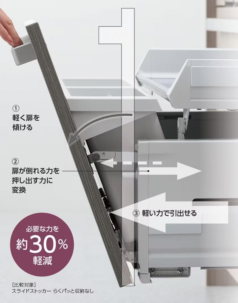 テコの原理を応用して、軽い力でスムーズに開閉できるため、片手でも引き出しやすいのが特長です。