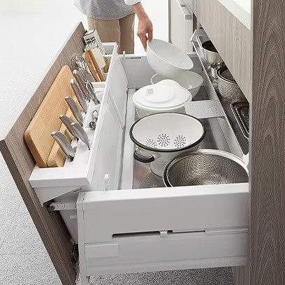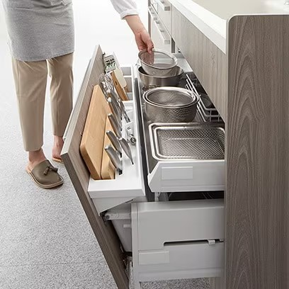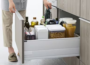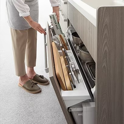 スライドストッカーは「大容量かつ使いやすい収納」を実現したユニットです。調理時や片付け時の動線を考えて、しまう・取り出す動作がスムーズに行えるよう工夫されています。