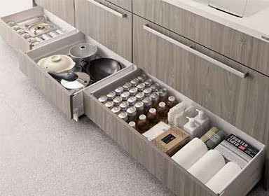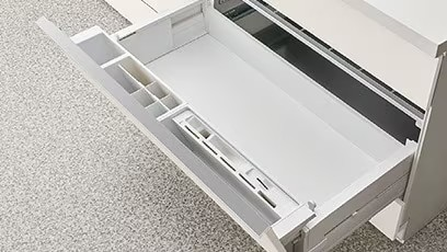 奥行きいっぱいまで収納できるロングスライド引出しで収納量もたっぷり確保。