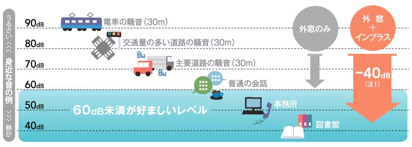 「今ある窓」と「インプラス」の間にうまれた空気の層が「防音壁」となり、気になる音を半減。