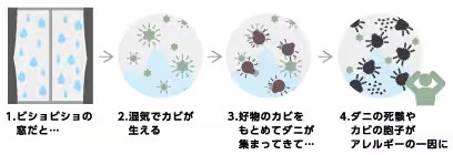 結露を放っておくと、湿気を好むカビやダニが繁殖しアレルギーや喘息を引き起こしてしまう恐れがあります。