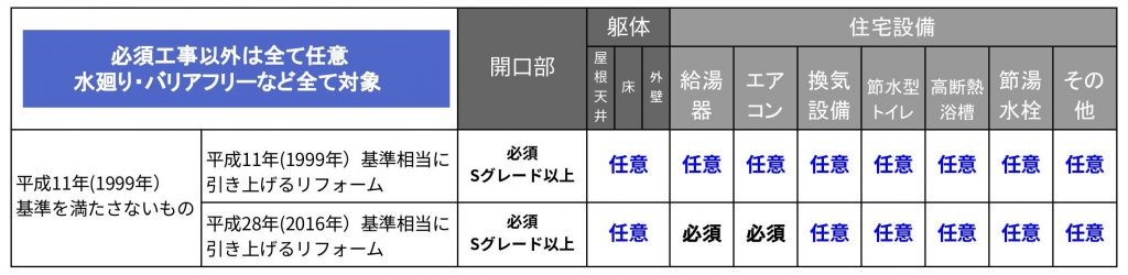 これまでの「2種類以上の必須工事」という条件は廃止され、必須工事+任意工事を組み合わせる方式に変更されました。