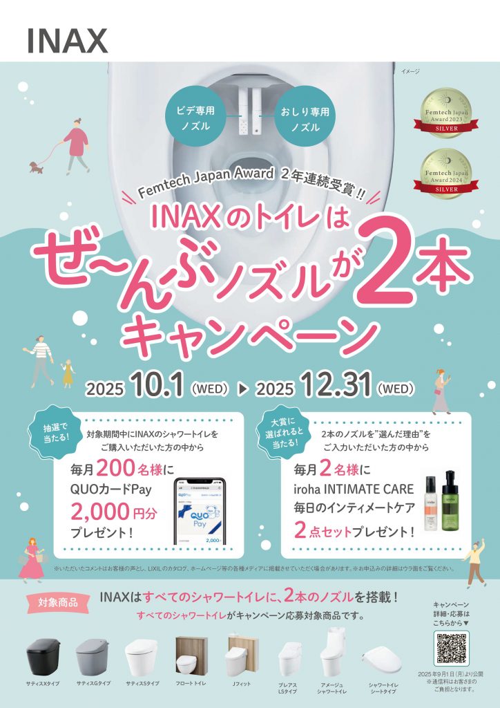 対象期間中にINAXのシャワートイレをご購入いただき、ご応募いただいた方の中から抽選でクオカードペイをプレゼント!
